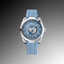 This 43 mm Worldtimer features a brushed and polished stainless steel case paired with an integrated blue rubber strap, accented by a polished link for a seamless finish. Its sun-brushed dial in Summer Blue displays vertical teak stripes, rhodium-plated hands, and luminous indexes glowing in light blue Super-LumiNova.