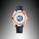 This 43 mm Worldtimer stands out with its polished 18K Sedna™ gold case, seamlessly integrated into a refined blue leather strap by a solid gold link.